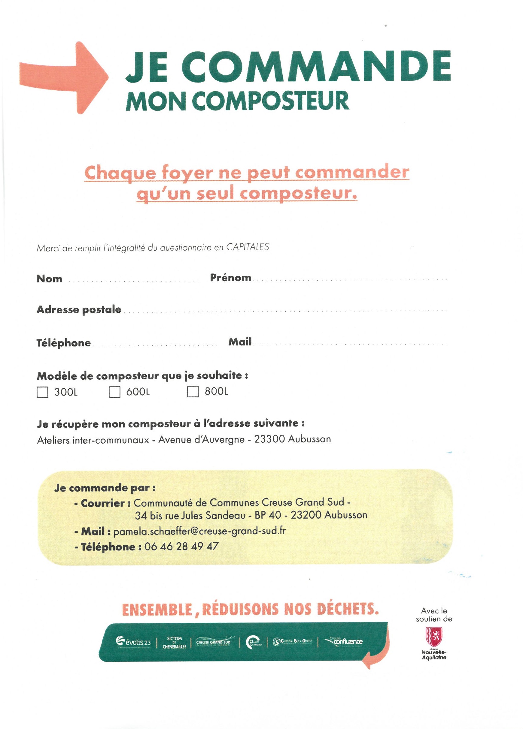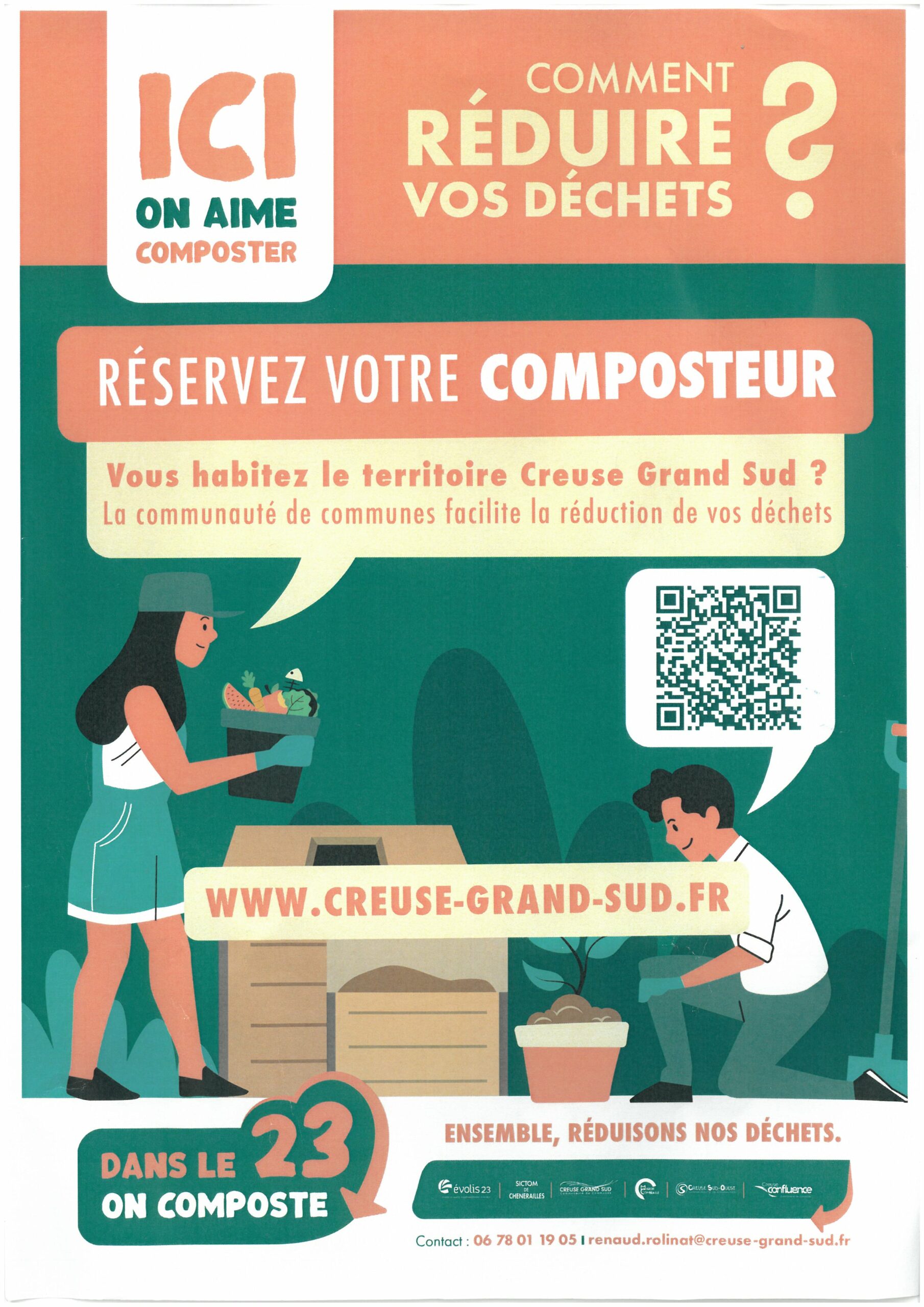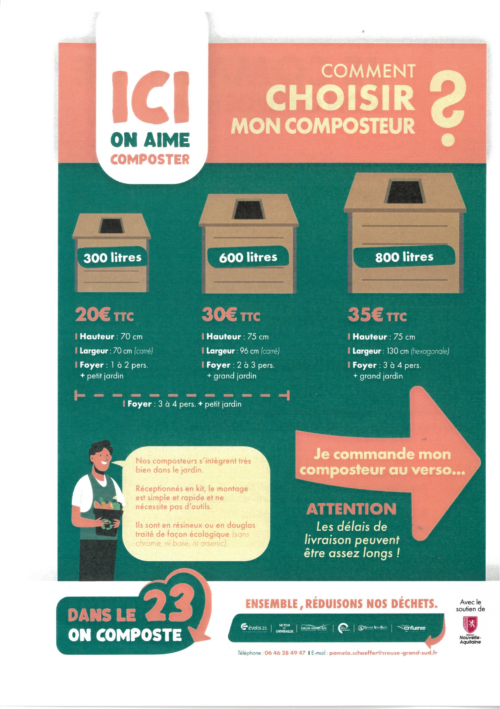 La communauté de Communes Creuse Grand Sud vous propose de commander vos composteurs via le lien suivant : https://creuse-grand-sud.fr/environnement/decheteries/compostage/